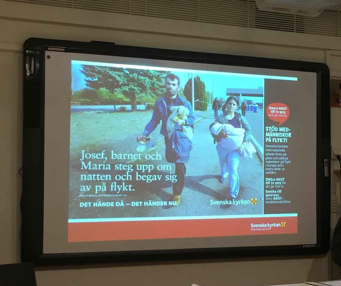 For noen år siden hadde Svenske kyrkan en julekampanje i Stockholm. Da Oslo bispedømmeråd besøkte Stockholm stift, fikk vi se bilder som gjorde sterkt inntrykk. På store skilt overalt i byen kunne vi se bilder som dette, av mennesker på flukt. Sammen med de gamle ordene fra Lukas og Matteusevangeliet ble de en viktig kontekstualisering av julebudskapet; "Det hände då - det händer nu".